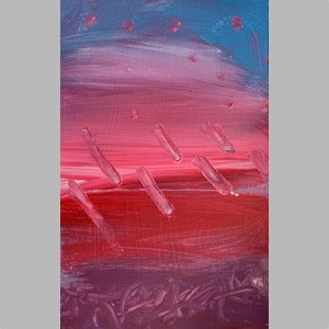 Rich purple and red tones combine to give a sense of mounting dread at the impending apocalypse. Dynamic slashes across the centre of the canvas evoke a meteor shower or crashing spaceship. Yet the overall effect is still one of peace, as though somehow the inevitability of the oncoming storm liberates the viewer from earthly concerns.